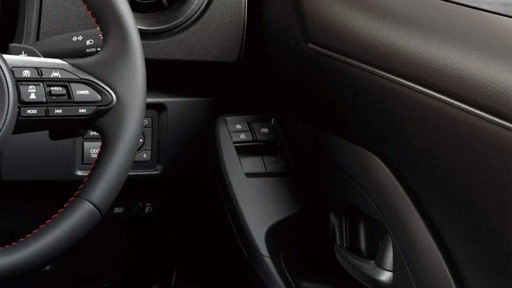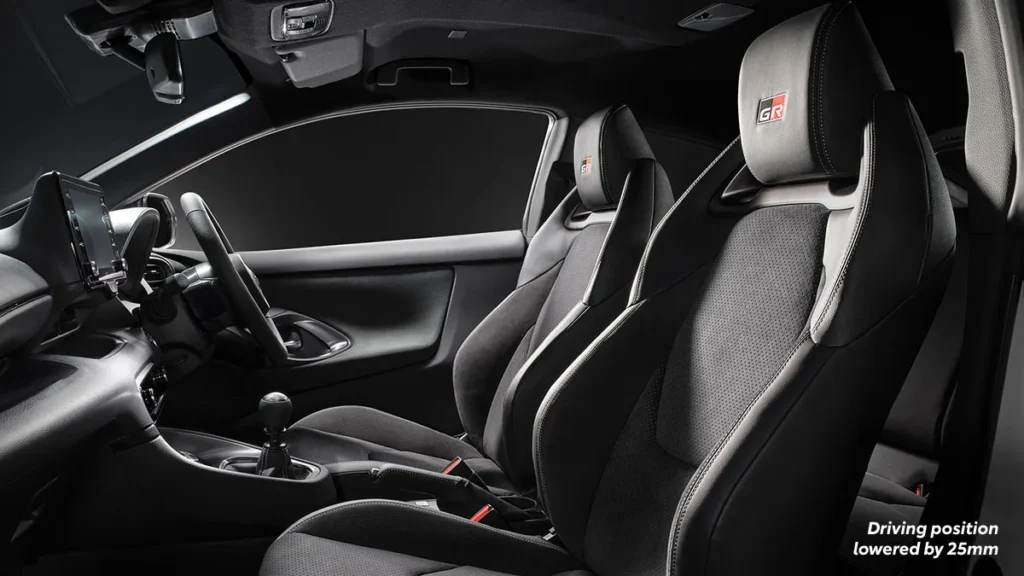 Kabin dirancang untuk pengemudi sejati dengan posisi duduk rendah, setir GR, pedal aluminium, serta kursi bucket Alcantara. Fitur hiburan tetap lengkap dengan layar 8” touchscreen, Apple CarPlay, dan sistem audio JBL.
