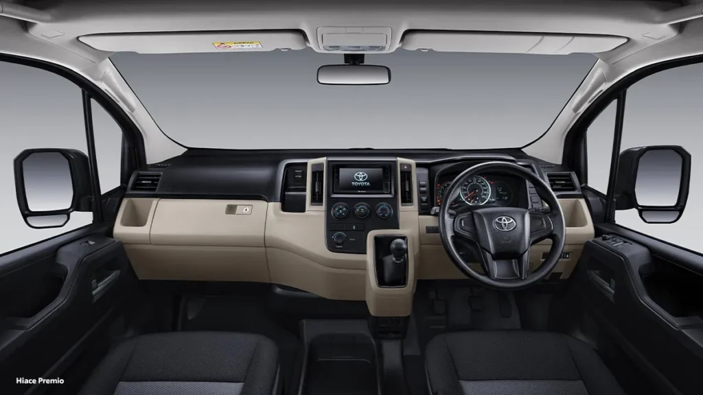 Eksterior Hiace Premio tampil profesional dengan desain bodi boxy aerodinamis, kaca besar untuk visibilitas luas, dan tampilan elegan khas kendaraan premium Toyota. Dengan transmisi manual 6-percepatan, Hiace menawarkan kontrol optimal di segala kondisi jalan.